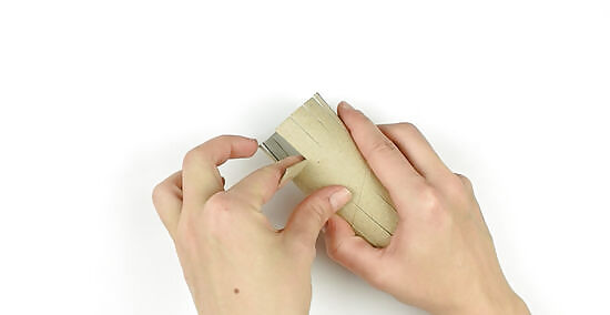 Turn a toilet paper roll into a sunshine wheel for your cat to roll around. Use a pair of scissors to cut vertical tabs around each end of a cardboard toilet paper roll. Make the tabs ⁄2 in (1.3 cm) wide and about 1 in (2.5 cm) long. Then, fold back each of the tabs so they fan out like sun rays around each end of the toilet paper roll. Before cutting the toilet paper roll, use a glue stick to adhere a piece of colored or decorative paper to the outside of the roll. This will make the toy more aesthetically pleasing.