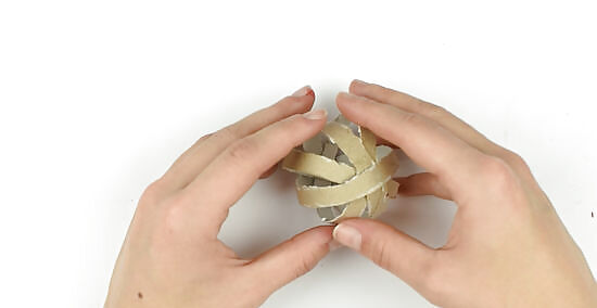 Make a gyroscope-looking ball out of a toilet paper roll for your cat to swat. Measure and mark four ⁄4 inch (0.64 cm) sections onto a cardboard toilet paper roll. Cut out the 4 rings and discard the leftover toilet paper roll. Take 2 of the rings and insert one into the other so that they roughly form a sphere-shape. Insert the third ring so it rests within the empty space between the first 2 rings—defining the sphere-shape further. Repeat this process for the last ring, and then secure the top and bottom cross-sections with some hot glue. Give the gyroscope ball as is to your cat to play with, or elevate the experience by putting a small treat inside of it. Wrap the rings with yarn before assembling to create a tacky surface for your cat to grip onto.
