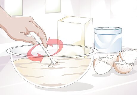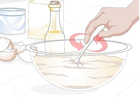 Mix the ingredients. Place the chicken broth, oil, powdered milk, egg, and flour in a large mixing bowl. Use a spoon to stir the ingredients until they are thoroughly mixed.