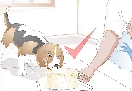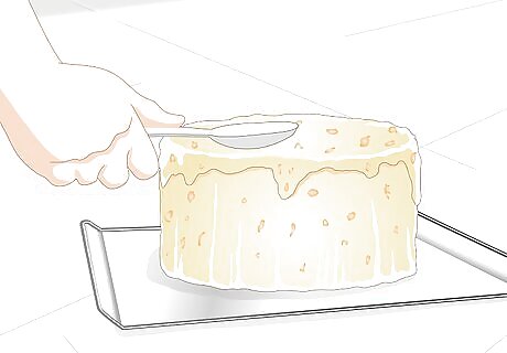 Ice the cake. When the cake has cooled, invert it onto a plate or doggy dish. Scoop the cottage cheese onto the cake and spread it around with a spoon. If your dog doesn't like cottage cheese, you can also ice the cake with cream cheese or mashed bananas. Don't ice the cake with regular cake icing, since it might hurt the dog's stomach.