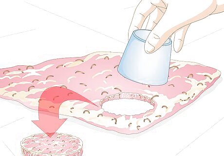 Cut the meat dough. Use a biscuit cutter or the rim of a glass to cut biscuit shapes from the meat dough. Lay them on a greased baking sheet as you go. If you have scraps of meat dough left over, ball it up, press it flat, and cut out more biscuits.