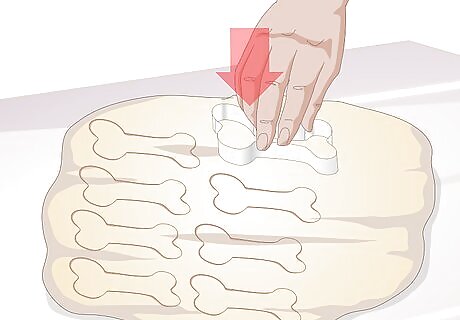 Cut the dough. Use a bone-shaped cookie cutter to cut the dough into bone shapes. Lay the bones on a greased cookie sheet. Once you've cut as many bones as you can, gather the dough scraps and roll them into a ball, then use the rolling pin to flatten the dough again. Cut more dog bone shapes from the dough using the cookie cutter. If you don't have a dog bone-shaped cookie cutter, use another fun shape for your dog's treats. Go for a holiday themed cutter, like a tree or a snowflake, or use a classic shape like a star or a circle.