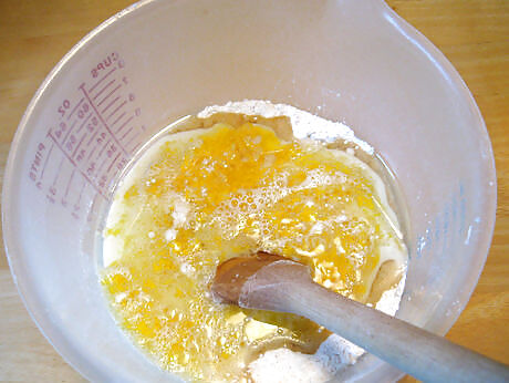 Stir in the additional ingredients. Add 2 tablespoons almond milk, 1/2 teaspoon of baking powder, 2 tablespoons of flour.