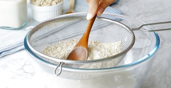 Once done blending use a sieve to get rid of the left over pieces of oatmeal. Place the sieve over a large bowl and pour the oat milk in slowly. Keep doing this until there is no more oatmeal left inside the milk.