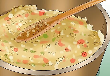 Cook the mixture until the chicken and rice are cooked through. When the mixture has come to a boil, lower the heat to medium-low. Continue cooking the mixture until the chicken is cooked through and the rice is tender, which should take approximately 25 to 35 minutes. Be sure to stir the mixture occasionally as it cooks so the rice doesn’t stick to the pot.