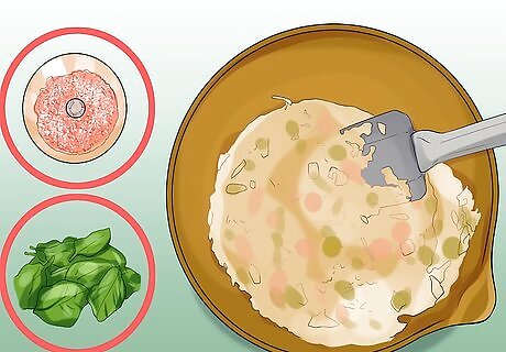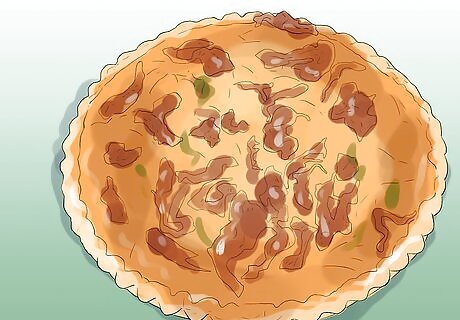 Stir in the spinach and ham. After you’ve mixed in the cheeses, add the drained spinach and ½ cup (75 g) of finely chopped ham to the bowl. Gently fold them in until they are fully incorporated. You can add other vegetables to the quiche if you like. Peppers, tomatoes, and onions are tasty options. You can substitute another cooked meat for the ham if you prefer. Bacon and pepperoni are good options.