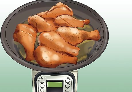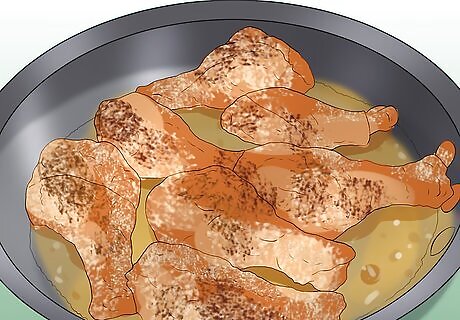 Brown the chicken in olive oil. Place a large, heavy-bottomed pot on your camping stove. Add 2 tablespoons (30 ml) of olive oil and 4 chicken breasts with the skin and bone still in place, and heat them over medium-high until the chicken is golden brown, which should take 2 to 3 minutes per side. For the most flavorful dish, season both sides of the chicken breasts with salt and pepper before you brown them.