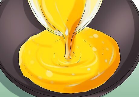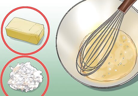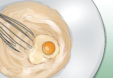 Whisk the eggs and flour together. Add 2 eggs and ⅓ cup (42 g) of flour to a large bowl. Use a whisk to blend them together until the mixture is light and fluffy. You can use egg substitute in place of the eggs if you prefer.