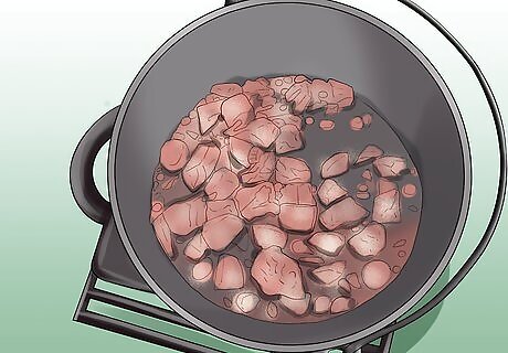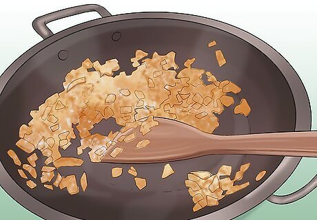 Saute the onion until lightly browned. When the beef is finished cooking, transfer it to a bowl and set aside for the moment. Add 1 cup (150 g) of diced onions to the pot, and saute them until they are slightly brown, which should take 2 to 3 minutes. Stir the onions periodically so they cook evenly.