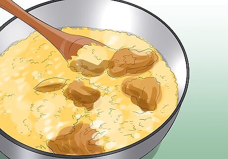Add the stock and bring the mixture to a boil. Once the rice is slightly browned, pour 3 cups (700 ml) of chicken stock to the pot. Allow the mixture to come to a boil, which should take 5 to 7 minutes.
