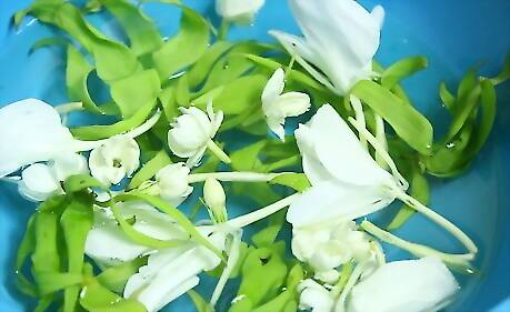 Take the flower petals out of the water to prepare for pouring the water. Make sure that it's the scent you want it to be.
