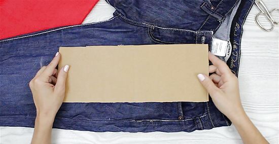 Lay out the jeans flat on a piece of cardboard. Before you start cutting, make sure you have a flat surface. This will ensure further precision.