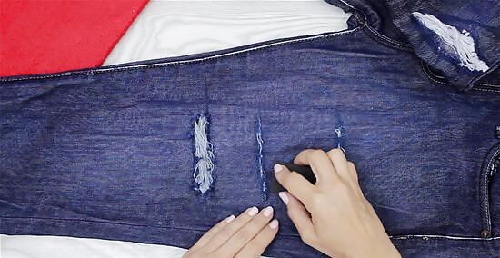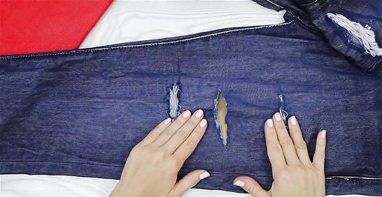 Add fabric patches to cover your skin or add a personal touch. If you want to wear ripped jeans without showing too much flesh, you can sew denim patches behind the holes. This can also be a way to add something personal, like a fabric with a logo or image peaking through your rips.