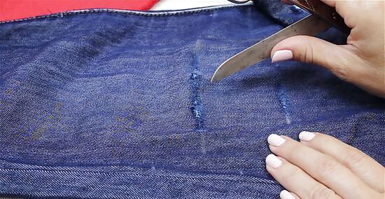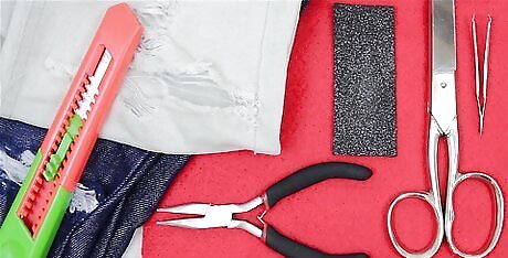Get tweezers and a small pair of sharp scissors. Having small but very sharp scissors, like nail scissors or sewing scissors, is crucial for precision. In addition, grab a pair of tweezers for pulling the denim threads easily. If you cannot find scissors, a shaving razor or snap-blade knife can work as well.