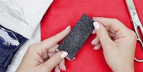 Buy sandpaper to make distressing easier. You can find sandpaper at many retail stores, such as CVS, Walmart, or Home Depot. Although you can make ripped jeans without this, the coarseness of the sandpaper will make it easier to distress the denim and pull out the threads. Go for a 30- or 60-grit sandpaper. If you don’t have sandpaper, try to find a cheese grater, steel wool, pumice stone, or foot file for a similar effect.