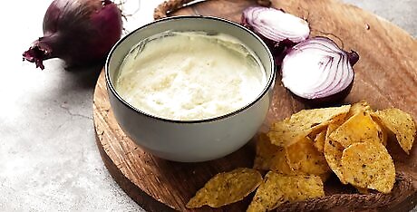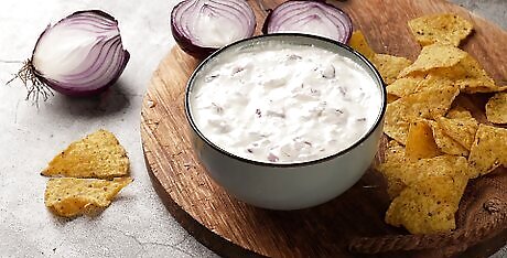 Make your dip. While your onion cooks, measure 16 ounces (454 g) of sour cream into a mixing bowl. Once your onion has browned, transfer it to the mixing bowl (or a fine strainer to drain first, in case you used a lot of oil). Mix the onion into the cream with a serving spoon, and you’re good to go.