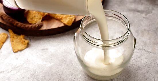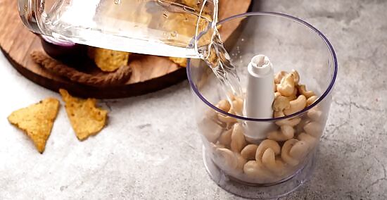 Make it vegan. First, measure 1 cup (150 g) of raw cashews into a bowl. Then cover with boiled water and let them soak, ideally overnight. Once they have softened, strain the nuts and dump them in a blender. Add ½ cup (118 ml) of water, 1 teaspoon of nutritional yeast, ¼ teaspoon of salt, and ¼ cup plus 2 tablespoons of lemon juice (89 ml). Then: Blend them together on a high setting, pausing to push any build-up along the sides back down with a spoon. Continue to blend for five to seven minutes, until all contents have blended and smoothed into a creamy texture.