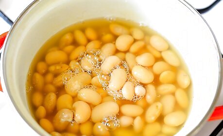 Strain the beans. Turn off the burner and remove the pot from the heat. Pour the contents of the pot into a colander to strain the tender beans. Set the cooked legumes to the side.