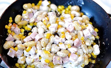 Mix in the cream and diced ham. Sprinkle in ¼ cup diced country ham. Pour ¼ cup heavy cream over the corn-bean-ham mixture. Continue to cook until the cream has reduced, glazing the vegetables and ham. Turn off the burner and remove the succotash from the heat. Season the dish to taste and serve.