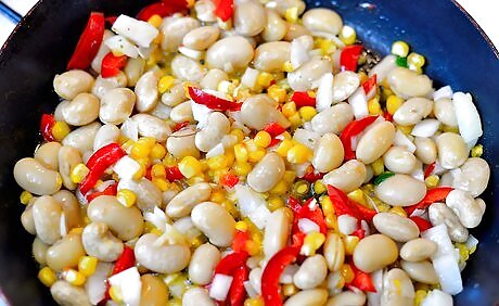 Sauté the vegetables. Pour 2 tablespoons vegetable oil into a large, nonstick skillet. Heat the oil over medium heat. Add ¼ cup red bell pepper, ¼ cup onion, and 2 cloves of minced garlic. Cook these ingredients for 2 minutes, stirring regularly. Add 1 ½ cups edamame, 2 cups corn, and 3 tablespoons white wine or vegetable stock. Cook for an additional 4 minutes, stirring frequently.