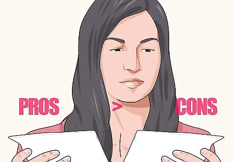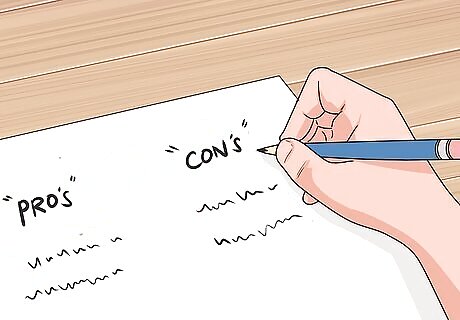 Create a list of pros and cons. Sometimes tough decisions can feel overwhelming and it can be difficult to keep all the facts, pros, and cons straight. To aid you in not feeling overwhelmed, write things out in a concrete way. Create a two column table, one column for a list of pros (i.e., things that would be or might be good if you made the decision) and one column for a list of cons (i.e., things that would be or might be bad if you made the decision).