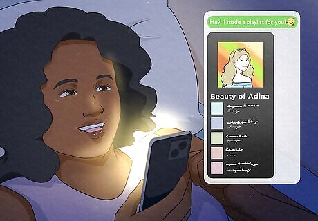 Use music to tell her how you feel. Music on its own can be very romantic, but making your significant other a playlist of all the songs that remind you of her would be the cherry on top. Think about songs she loves, as well as songs you listened to when you first got together. This jolt of nostalgia will remind her of what falling in love with you felt like, and give you bonus points for thoughtfulness to boot! Here are some love songs you might consider featuring on the playlist: “Birds of a Feather” by Billie Eilish “Lover” by Taylor Swift “Beautiful Things” by Benson Boone “Good Looking” by Suki Waterhouse