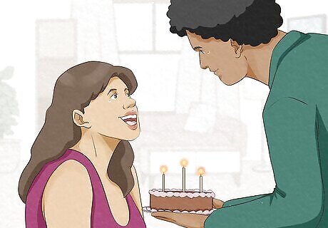 Go all out for her birthday or your anniversary. For special occasions like birthdays or anniversaries, a grand gesture is in order. Buy her or bake her a cake, and give her a hand-written card telling her how much you love and value her. A good rule of thumb is to do one public thing for her and one private thing. Underwood recommends “A really extravagant floral arrangement, a romantic dinner, a gift card to the spa, jewelry, or a surprise vacation or getaway.”
