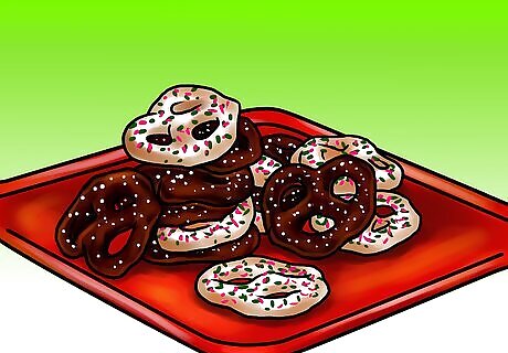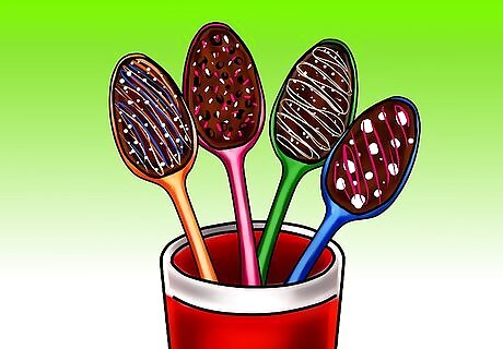 Make chocolate dipped spoons. Go to your local dollar store or discount supermarket and stock up on plastic spoons (buying some red/ green spoons and decorating them with curled ribbons would add a festive flare). Melt chocolate in the microwave on 50 percent power for one minute (if you have a fixed setting, do it for 30 seconds). Stir, and continue melting in 10-second increments at 50% power until smooth. Dip spoons until generously covered with chocolate. Lay them on waxed paper lined cookie sheet to cool down. If you want to get fancy, roll in crushed peppermint candies or drizzle them with melted white chocolate or sprinkles.