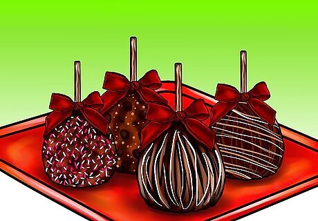 Make gourmet candy apples. Buy a bag of apples, preferably Red Delicious or Granny Smith apples, as they work best for this project. You'll also need semi-sweet chocolate, wooden sticks or skewers, cellophane wrap, and the toppings of your choice (peanuts, coconut, cookies, etc.). Melt the chocolate in a double-boiler on the stove. Skewer the apples and dip into melted chocolate. Roll into a topping and allow to dry. Wrap in cellophane. You can use colored cellophane or add a pretty bow. These are a delicious treat for your friends and family.