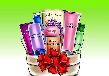Give fancy soap. Buy a glycerin soap block, found in most craft stores, divided into small cubes or make your own. Tie ribbon around the block to make a loop, turning at ninety degree angles to create each additional loop. Carefully run one scissor blade on the back of the ribbon until you have completely curled it. Repeat with the other side. They will look like gourmet soap and cost a fraction of the price.