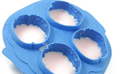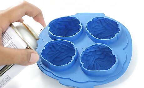 Remove the shots from the mold. When the jello has had at least several hours to set and is completely firm, remove the brains from the refrigerator. Flip the molds over onto the baking sheet. Gently peel the side of the mold away from the top of the jello to remove the brains.