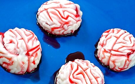 Transfer the brains to a serving platter and add the blood. Move the brains from the baking sheet and arrange them on a large flat plate or serving platter. Place one to two drops of red food coloring or raspberry syrup onto each brain to make the brains look bloody. The red food coloring is optional, and the brains will be just as yummy if you choose not to add it.