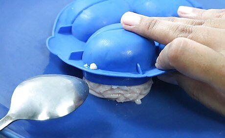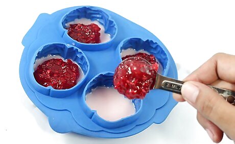 Add the raspberry filling. Once the jello has had time to firm up, remove the brains and the raspberry filling from the refrigerator. Add a teaspoon (7 g) of raspberry filling to the jello in each mold. Don’t let the filling touch the sides of the mold, otherwise the two halves of the brain won’t seal together properly. You can add as much or as little filling as you like, as long as the filling doesn’t touch the mold.