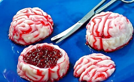 Slice the tops off the brains before serving. Once the brains have been plated and garnished with blood, you can serve them as is. Or, for an added effect, cut the tops off of each brain to reveal the filling inside. After slicing off the top, lay each top back on the brain, but slightly to the side so you can see the filling. Now your zombie brain jello shots are ready to serve and enjoy!