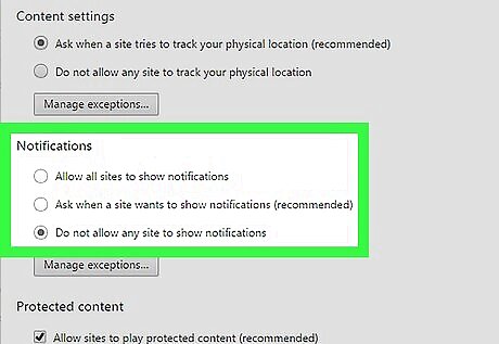 Set your Notification preferences. Choose one of the following options: Allow all sites to show notifications. This allows any website you visit to push notifications to your desktop through Chrome. Ask when a site wants to show notifications. If you visit a website that wants to send notifications to your computer, you’ll be prompted to allow or deny them. This is the default setting. Do not allow any site to show notifications. This disables all notifications from websites.