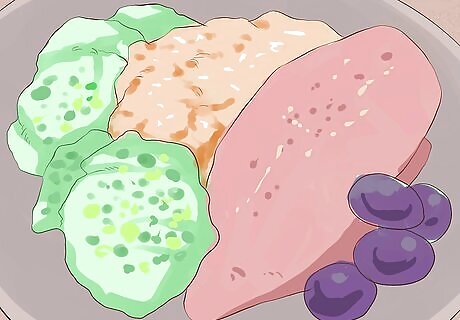 Understand the basics of a well-balanced meal. Planning dinners may look daunting, as they are usually made up of 2-3 separate parts. However, the basics of a well-balanced meal are actually pretty simple. You want a main dish, usually a grain (pasta, rice, couscous, etc.), a protein like chicken, beans, or fish, and at least 1-2 vegetables or fruits. Think of each dinner as three separate parts -- a grain, a vegetable, and a protein. Pick three simple recipes instead of trying to make one all inclusive dish each night.