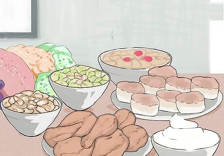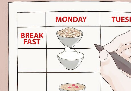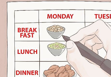 Count out how many meals, and what type of meal, you need to plan for. A good way to do this is to simply look back on the last week of meals. What days did you go out to eat? What days did you have left-overs? What days did you have plenty of time to make a great, huge meal? It is a generally a good idea to plan your meals for no longer than a week in advance, since plans can change and food might go bad. Jot down all the meals you ate last week and see how many meals, and what type, you need to plan for: Breakfast: Do you make a unique breakfast sometimes, or do you generally eat the same thing each morning? Lunch: Do you eat out while at work, or do you pack lunches? Dinner: What days do you cook? What days do you eat out or eat leftovers? Snacks: How quickly do you go through snack foods? Do you need these foods, or do you just eat them because you were around.