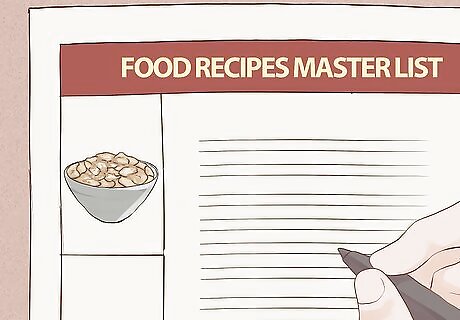 Make a "master list" of your favorite recipes and meals. Collect your favorite recipes online and out of cookbooks, helping you quickly fill in your schedule with new meals. If you don't collect recipes or don't know where to begin, head online and search for recipes with some of your favorite ingredients, your schedule (ie. "1-hour dinners"), or simply peruse food blogs or websites. A quick internet search for "best recipes" will pull up far more food than you could ever conceivably try. Sites and apps like FoodGawker let you search recipes by style, time, ingredients (including ingredients you want to avoid) and popularity. Remember to look up sides too, like salads or vegetable dishes, and not just the main course.