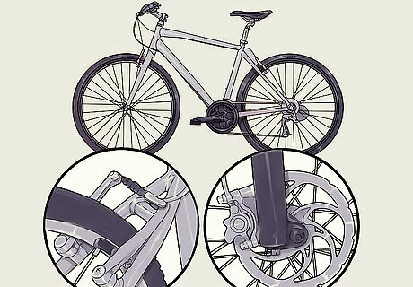 Understand the different types of brakes. There are two large subdivisions of brakes -- rim brakes and disc brakes. Almost all mountain bikes, aside from entry level, use disc, while road bikes have much more variety. Rim Brakes come in many forms, but they all function by clamping onto the rim of your wheel and holding it in place to slow you down. There are two big pads on either side of both wheel the squeeze when you let go. They are cheaper and easier to fix and maintain than discs. Disc breaks rely on a separate steel disc attached to your wheel that the brakes grab in order to slow down the entire wheel. They are often more sensitive than rim brakes, and the tight space between the breaks prevents sticks,leaves, etc. from catching on the brakes and ruining them mid-ride. They are, however, harder to manage and calibrate without prior knowledge.