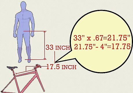 Take your inseam measurement to determine frame size. Stand with your feet 6 inches apart and measure from the inside of your foot up to where your leg meets your waist, between your crotch and inner thigh, in inches. Multiply this number by .67, then subtract 4" to 5" from the answer to get the estimated length of your top tube, which is the part of the frame running from the handlebars to below your seat. Use the top-tube for your measurement when possible, as seat tube (pedal to seat) measurements are tricky to determine and change from manufacturer to manufacturer. If you have a 33-inch inseam, you need a 17.5" top tube, since:33" x .67 = 21.75" 21.75" - 4" = 17.75 Specialty bike makers Lapierre & Neil Pryde have different geometry. Multiply your inseam by .62 instead of .67 if you really want one of these bikes. If your bike shop gives frame size by seat tube length, multiply your inseam by .185. The number should be the distance between the top of your seat tube and the middle of the crankshaft, the circular piece attaching the pedal to the bike.