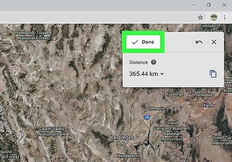 Click the Done button on the top-right. This button is listed next to a blue checkmark icon in a white pop-up box on the top-right. It will conclude your route, and show the total distance in the pop-up. Optionally, you can click the distance here, and select a different measurement unit like miles, meters, yards or inches.