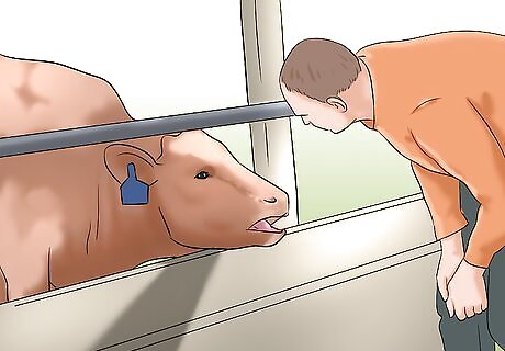 Pay a visit to a farm or ranch that has cattle you can start working with to rid this fear. Nothing works better than facing your fears. Doing so makes you a stronger and more confident person! Call a local farm or ranch and let the owner know what you're hoping to achieve; be polite and explain yourself clearly so that you don't leave the farmer wondering what the issue is. Make arrangements to go to the farm or ranch and spend some time around cattle. Be sure to ask the producer if they can spare some moments to be with you while you observe their cattle; they may be able to talk you through and teach you some bovine behavior to help ease your nerves. The farm or ranch visit should be at least 40 minutes in duration. Even longer would be better. If you can't make it to a farm or ranch, wait for a local animal show or agricultural fair to come near you, and visit the cattle in their stalls or pens as they wait to be shown.