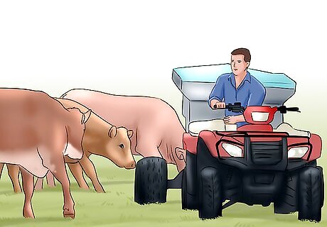 Watch the cattle and their movements. You've done the learning about cattle behavior, and now is the perfect opportunity to put your knowledge to the test. Are they just standing there staring at you, or are they milling about? Is there just one at the fence line acting aggressively (see above for indicators), or are there several that are not threatening you and merely following you as you walk along the fence? If you see a herd of cattle standing at the fence staring at you and starting to follow you when you walk away, these animals are not acting dangerous. They just want some handouts from you! Such a herd will also be swinging their heads back at the flies or to lick themselves, switching their tails nonchalantly, scratching themselves on a fence post, or, if they're relaxed enough, even start chewing their cud. After 15 to 20 minutes, if you haven't given them anything of interest, they will start to wander off and continue what they were doing. If you only have one animal (like the herd bull or a single cow) that's acting like he or she is agitated about your presence, then simply ignore them and move further away from the fence. Once you have moved a safe distance away (both to you and to them), then they will turn away and go back to where they were "stationed." Remember, you have a higher chance of getting hurt by such an animal if you are in the same pasture or corral as them. If you stay on the opposite side of the fence from the threatening bovine and practice avoidance techniques, then they will eventually leave you be.
