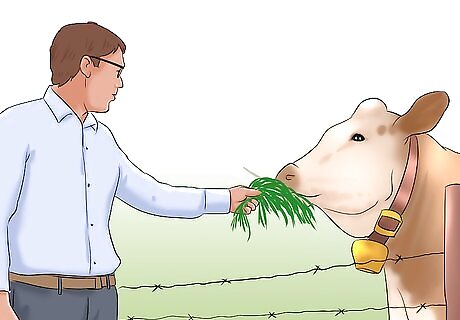 Learn the behaviours and body language of this bovine species. Knowledge is the best way to put your fears behind you. Most of the time when a bovine comes up to you they're curious about you, or they think they're going to get some treats from you (like a handful of grass, for instance). When a bovine is snorting, growling, or pawing the ground or throwing its head at you, or even giving you that look that looks like they're glaring at you, then move away from the fence and avoid eye contact. In the animal world, when you maintain eye contact with another animal that is visibly challenging you, that's deemed a threat. If you do not move away or make a threatening gesture towards that animal, this will often lead to an attack. The ones to be most concerned about are: Cows that are protecting their calves or bulls that are growling at you. Head tossing, pawing, showing their sides, growling, etc., are all warning signs that if you don't get out of their way or away from their space, they will charge. If an animal is not showing any these signs, then it's best to not worry about being attacked. Often even thinking negative thoughts will lead to negative behaviour from an animal.