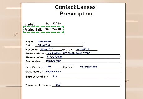 Check that all of the required information is on the prescription. Once you receive your prescription, look over it to make sure that it includes your name, the date of the exam, and the contact information for your optometrist. You should also see information on the manufacturer, base curve, power, and material of your lenses.