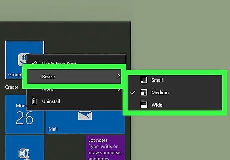 Resize a tile. Tiles are large by default, but you can make them larger or smaller if you’d like. Here’s how: Right-click the tile. Click Resize. Select a size.