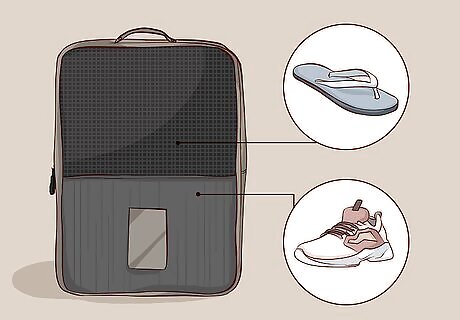 Put your extra shoes inside a bag to separate them from other items. Place the shoes in a shoe bag or any other spare bag you have lying around. This will keep them from getting anything else in your suitcase dirty. A shoe bag is a small, padded rectangular bag specifically designed to fit 1-2 pairs of shoes. You can use one of these or just use a shoe-sized packing cube or other bag that you are willing to dedicate to your shoes. You can fit the bagged shoes on top of all the other clothing or squeeze them into any spaces at the top, bottom, or sides of the luggage.