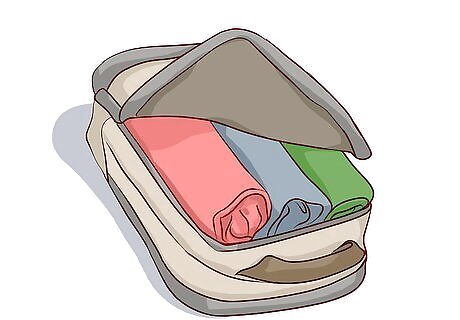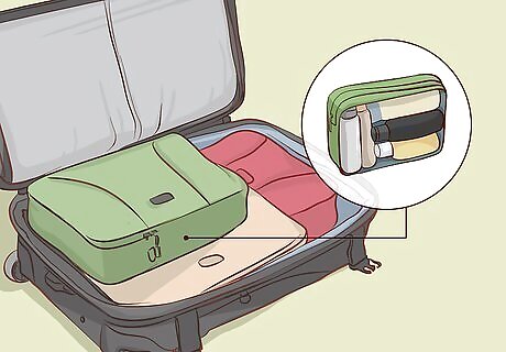Pack clothing into packing cubes or compression sacks to compress items. Put your folded and rolled clothing items into zippable packing cubes or compression sacks. Pack similar items together until each packing cube or compression sack is full, then close it, compress it, and put it in your carry on.Tip: You can leave larger rolled items, such as a fleece or a rain jacket, out of the cubes or sacks and pack them in on top of or around everything else. For example, pack all your T-shirts, nicer tops, and other top layers together in a single cube or sack. Put your jeans and other pants along with underwear and extra socks in another cube or sack. If you don’t have packing cubes or compression sacks, you could use large zip-top plastic bags instead. Make sure to squeeze out all the air and compress the items as much as possible before sealing the bags. Put the packed clothing into your luggage before everything else, then you can fit everything else around it.