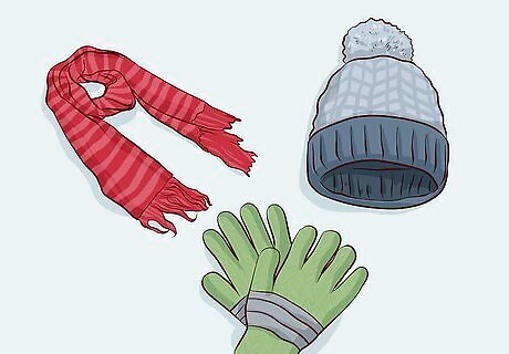 Add a warm hat, gloves, and a scarf for cold weather accessories. Choose a warm hat like a beanie, a set of lightweight wool gloves, and a warm scarf that isn’t too bulky. Make sure they go with your winter coat and other items you plan to wear them with.Tip: The kinds of gloves that are fingerless but have an attached mitten that you can put on and off to cover your fingertips are ideal. That way, you can uncover your fingers to use your phone or do something else without exposing your whole hands to the cold. If you aren’t sure what hat, scarf, and gloves to bring, just pick some that are a neutral color like black or gray. These will go with everything. If you don’t have these winter clothing items, you can always buy them when you get to your destination. You can usually even find most of these items at the airport when you get off the plane. Scarves are a great thing to wear on an airplane, even if you're not going somewhere particularly cold, as they can be used as a pillow on the plane ride.