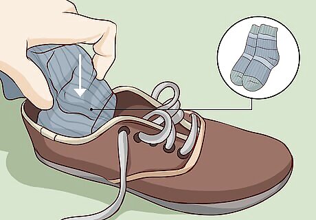 Stuff socks inside your extra pair of shoes. Fit as many pairs of socks as you can inside your second pair of shoes that you will pack. This will ensure you’re filling as much empty space inside your carry on as possible. Try to fit your thickest socks inside the shoes first. For instance, if you have a pair of thick wool socks, put these in first. If there is any room left, then you can put more socks inside the shoes, or just pack the extra socks with other clothing items.